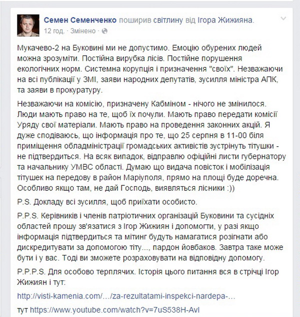 Про це на своїй сторінці в соціальній мережі повідомив голова ГО «Патріотична громада Буковини» Ігор Жижиян.
