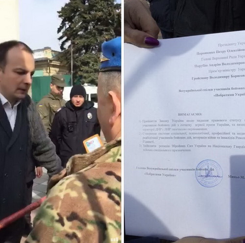 10 лютого 2017 року влада мала дати відповідь, але результат нульовий. 14 березня було призначено зустріч з Андрієм Парубієм, але з невідомих нам обставин вона не відбулася. Це зневага влади до народу, який її обрав. У стінах Верховної Ради відбулася суперечка між депутатом Тетяною Чорновол та учасниками бойових дій, на допомогу їй прийшов депутат Сергій Пашинський, конфлікт владнали.