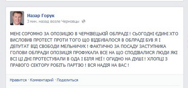 Після голосування всіх питань порядку денного депутати отримали змогу виступити з трибуни. Зокрема, перед депутатами та громадськістю виступив Назар Горук, який опротестував голосування депутатів і закликав активізуватися так званому Правому сектору. За що удостоївся репліки з вуст голови Чернівецької обласної ради Михайла Гайничеру: "Ви ж отримали керівну посаду в комунальній установі".
