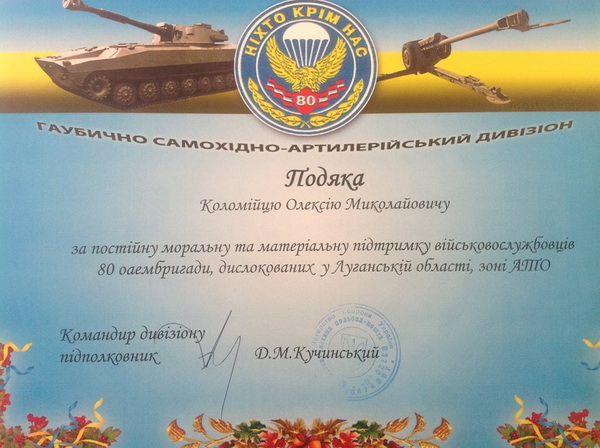 Із зони АТО було передано Подяку особисто голові Чернівецького «АВТО-МАЙДАНУ» Олексію Коломійцю за постійну моральну та матеріальну підтримку військовослужбовцям, які зараз на передовій дисклокованих у Луганській області. Хлопці 80-тої аейромобільної бригади дякують особисто Коломійцю за те, що він їх завжди підтримує морально та матеріально! «АВТО-МАЙДАН» періодично передає продукти харчування, засоби гігієни, прилади для нічного бачення. Та все те, чого потребують хлопці. «АВТО-МАЙДАН» ЗАВЖДИ З ПАТРІОТАМИ, ДЯКУЄМО, ЩО ВИ Є!!!