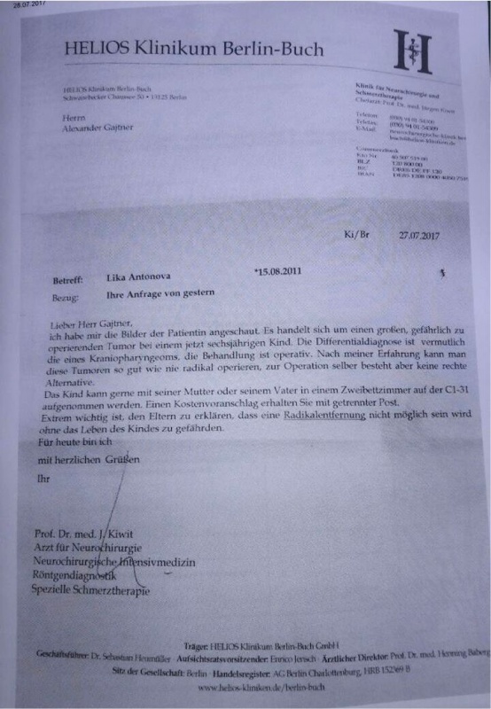 Нещодавно у дівчини почав різко падати зір, після своєчасного звернення до лікарів, був поставлений страшний діагноз: пухлина гіпатоламічної області мозку. Дівчинка потребує термінової операції, яку на сьогодні беруться зробити лікарі клініки Helios Klinikum Berlin-Buch. Вартість першого етапу лікування: 34 тис. євро.![]()