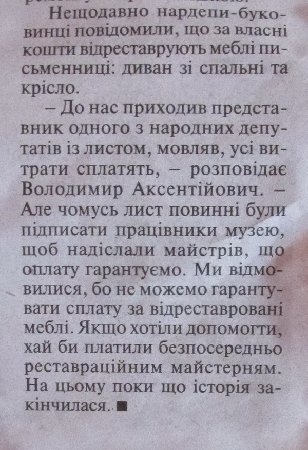 Сімнадцять нардепів наразі не виконали обіцянку оплатити реставрацію автентичних меблів Ольги Кобилянської