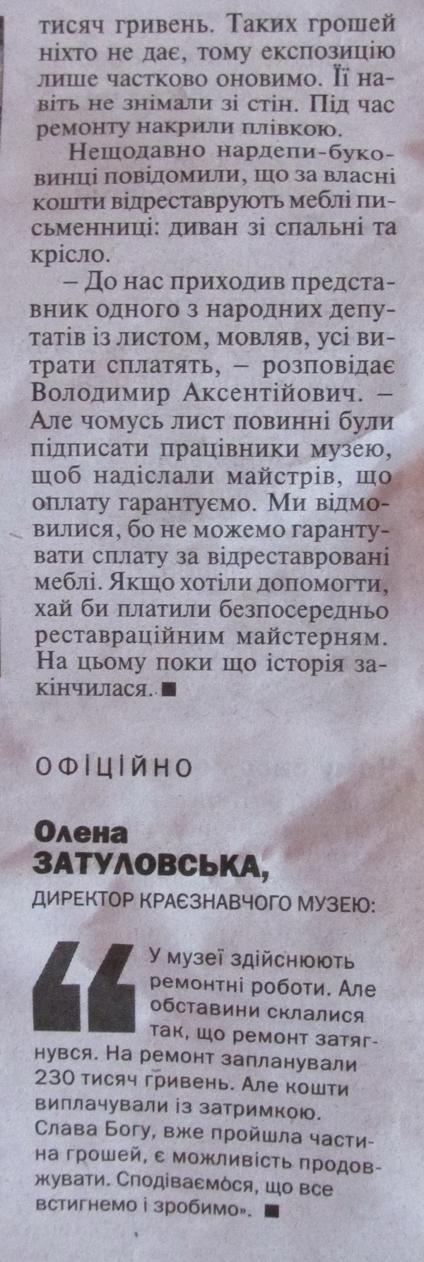 Про це кореспонденту "Молодого буковинця" повідомив директор музею письменниці Володимир Вознюк. Ідея скинутися на реставрацію автентичних меблів Ольги Кобилянської належала письменниці Марії Матіос. Про це під час прес-конференції повідомив народний депутат України Микола Федорук, який розповів журналістам про діяльність міжфракційного об’єднаня «Буковина». "Не буду говорити про всі питання, які розглядають 17 депутатів. Скажу тільки про одне, яке ми ухвалили за ініціативою Марійки Матіос. І жоден не відмовився, - розповів Микола Федорук. - Ми вирішили, що будемо брати участь у відзначення 150-річчя Ольги Кобилянської. Це наша конкретна фінансова участь у реставрації автентичних меблів музею. Ми виділяємо на це кошти, а роботи виконуватимуть київські майстерні. Це буде наш вклад у відзначення ювілею". Очевидно варто також зауважити, що влада теж не виконала обіцянок відремонтувати музей видатної писменниці.