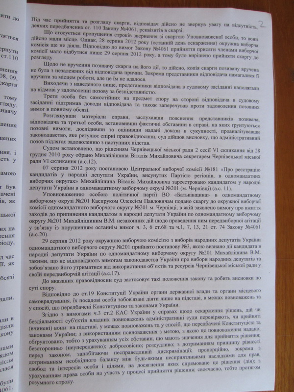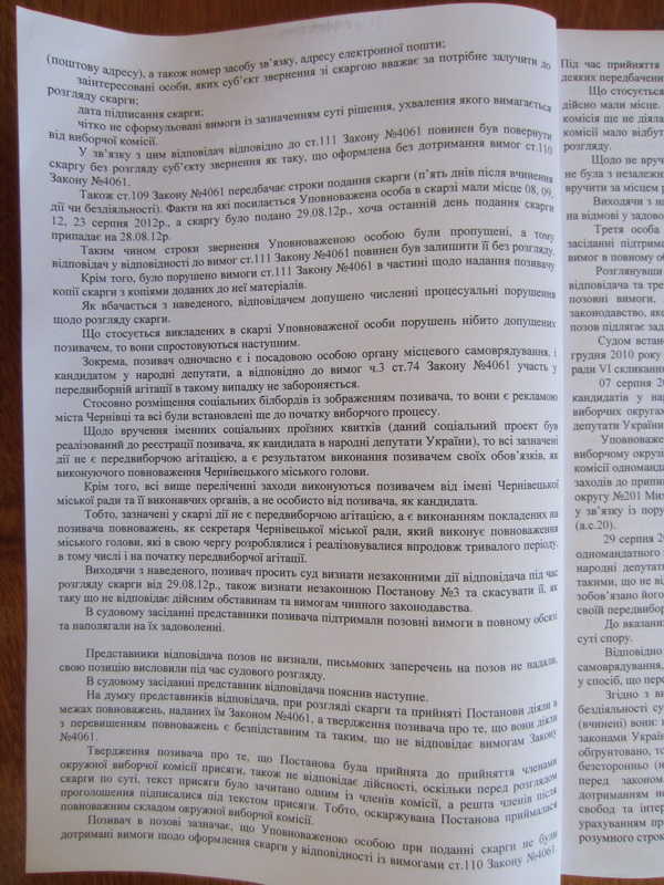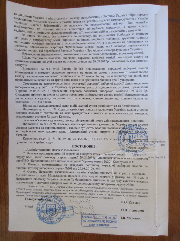 Сьогодні, 02 вересня 2012 року, Чернівецький окружний адміністративний суд визнав протиправною і скасував постанову окружної виборчої комісії по одномандатному виборчому округу №201 від 29 серпня 2012 року №3, - повідомив BukNEWS координатор виборчих програм Громадянської Мережі ОПОРА у Чернівецькій області Назар Тимощук (063 628 67 71, [email protected]). (http://oporacv.org/ovk-vyznala-diji-myhajlishyna-porushennjam/).