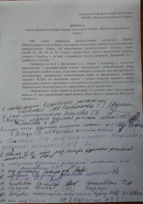Голова первинної профспілкової організації нашого бюро створила і підтримує в колективі ворожнечий та несприятливий клімат – зазначила старший лаборант відділення загальної патології № 2 Самойлова Катерина Миколаївна – вона неодноразово погрожувала мені, середньому і молодшому медичному персоналу, а часом і лікарям, коли ми займали позицію, яка протирічила її уподобанням, принижувала нас та погрожувала. Враховуючи, що терпіти це більше не можливо, колектив вирішив оголосити недовіру профкому, що своїми підписами засвідчило більше 1/3 членів колективу.