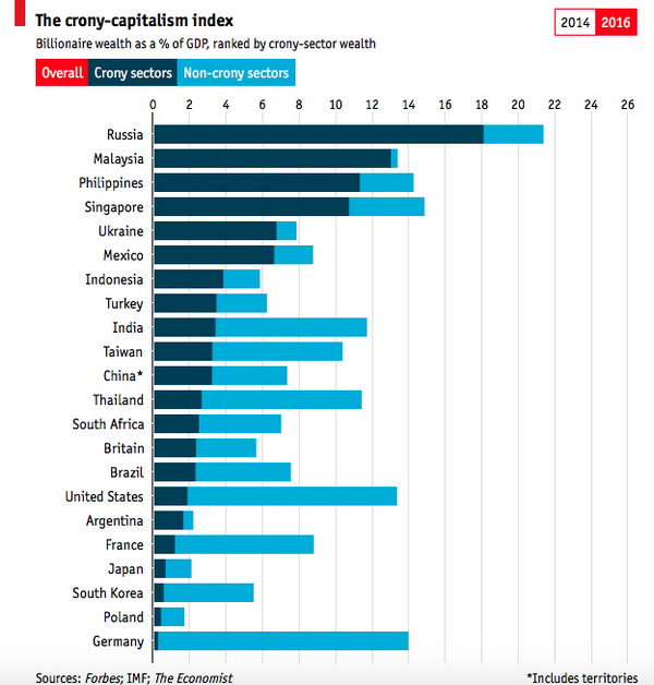І, нарешті, сукупний дохід мільярдерів, отриманий завдяки зв'язкам у владних колах, представлений в процентному відношенні від ВВП країни. Таким чином, Україна опинилася на 5 місці в рейтингу "кумівського капіталізму" The Economist.