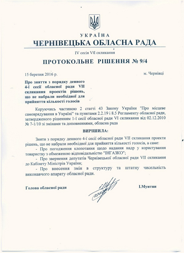 Результати голосування, яке відбулося без жодних порушень, засвідчили той факт, що проект рішення «Про погодження клопотання щодо надання надр у користування товариству з обмеженою відповідальністю «Інгазко» не набрав необхідної для прийняття кількості голосів. У зв’язку з цим, відповідно до пунктів 2.2.19 та 8.5 Регламенту обласної ради його було знято з порядку денного відповідним протокольним рішенням. Відтак голова обласної ради Іван Мунтян поінформував про це Державну службу геології та надр України.