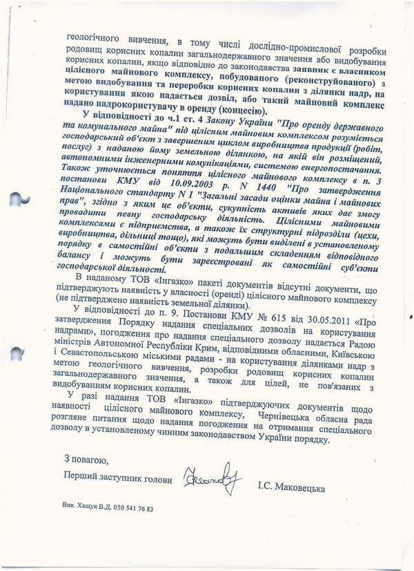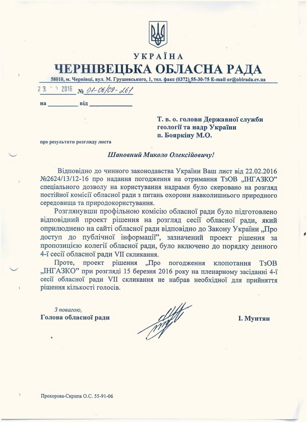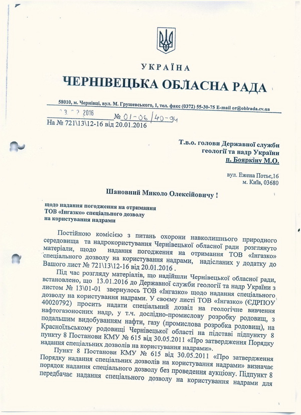 20 січня 2016 року до Чернівецької обласної ради надійшло клопотання Державної служби геології та надр України щодо надання погодження на отримання спецдозволу на користування надрами дійсно звернулося ТОВ «Інгазко». Так, у своєму запиті, посилаючись на Порядок надання спеціальних дозволів на користування надрами, затверджений постановою Кабінету Міністрів України від 30 травня 2011 року №615, вказане товариство з обмеженою відповідальністю просило про надання такого дозволу без участі в аукціоні.
