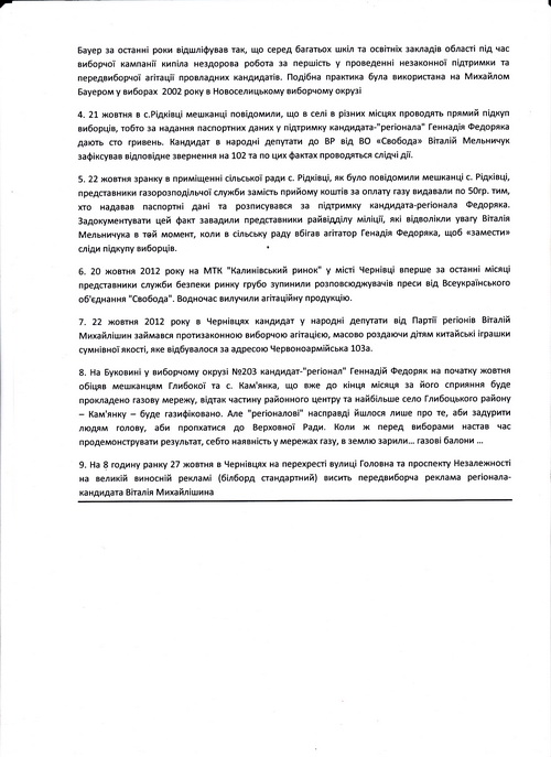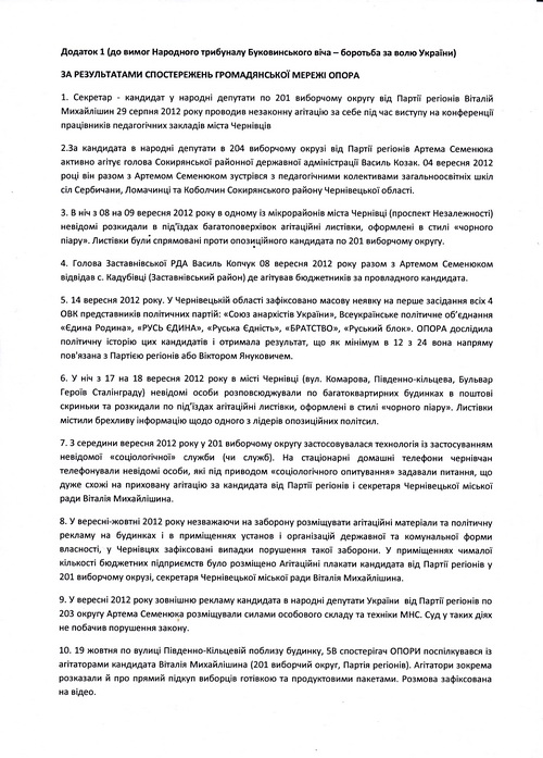 Надаємо інформацію, що 7 листопада поштою відправлені на адресу Адміністрації Президента, Апарату Верховної Ради та в ЦВК вимоги Народного трибуналу Буковинського віча/ які були підтримані присутніми на урочистому мітингу «Буковинське віче – боротьба за волю України» 3 листопада на Центральній площі м. Чернівці/ з додатками 1(до вимог Народного трибуналу Буковинського віча – боротьба за волю України) (копії документів подаємо у додатку).