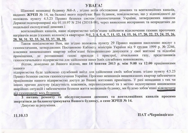 Акцію з проникнення працівників ПАТ «Чернівцігаз» до квартир чернівчан призначили на 14 жовтня 2013 року. Згідно з повідомленнями, які у своїх поштових скриньках виявили мешканці столиці Буковини, відключення газових проточних нагрівачів води (газових колонок) того дня мало відбутися у будинку № 8а по вул. Стасюка. Згідно з планами влади і приватної компанії без гарячої води мають залишитися 39 квартир!!!