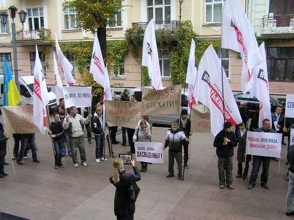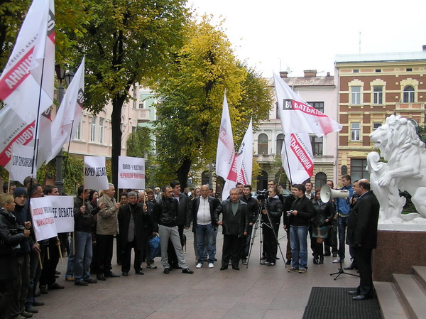 Під стінами Чернівецької ОДА представники Об’єднаної опозиції викликали на дебати губернатора Михайла Папієва та секретаря міськради Віталія Михайлішина. На мітинг ВО «Батьківщина» до «будинку з левами» у середу вранці прийшло кілька десятків людей.