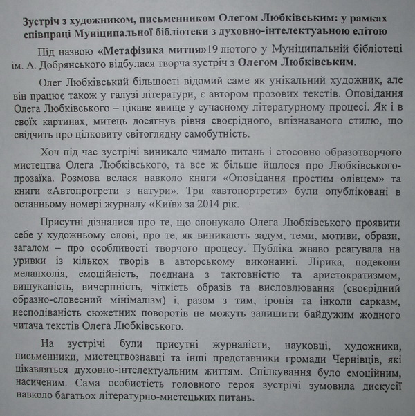 Проза Олега Любківського – справді цікаве явище у сучасному літературному процесі. У ній, як і в своїх картинах, митець досягнув рівня своєрідного, впізнаваного стилю, що свідчить про цілковиту світоглядну самобутність. До творів Олега Любківського хочеться повертатися, перечитувати/переглядати, смакуючи знову і знову кожною деталлю, роблячи у вже знайомому просторі нові відкриття.