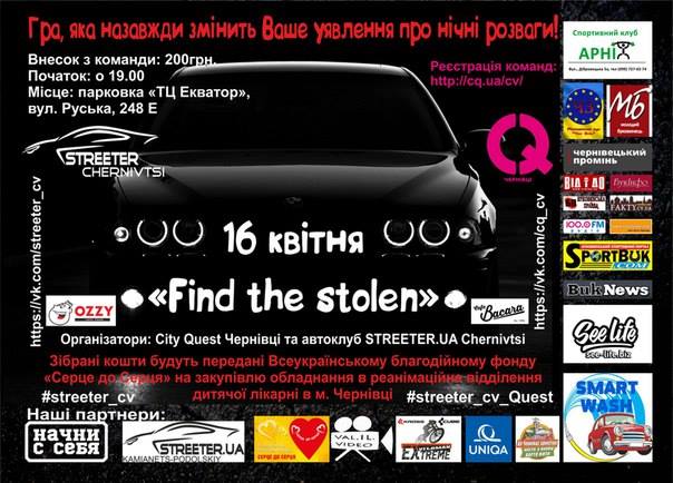У суботу, 16 квітня, о 19.00 годині на стоянці ТЦ Екватор, що по вул. Руська, 248 є розпочнеться гра АвтоКвест під назвою "Find the stolen".