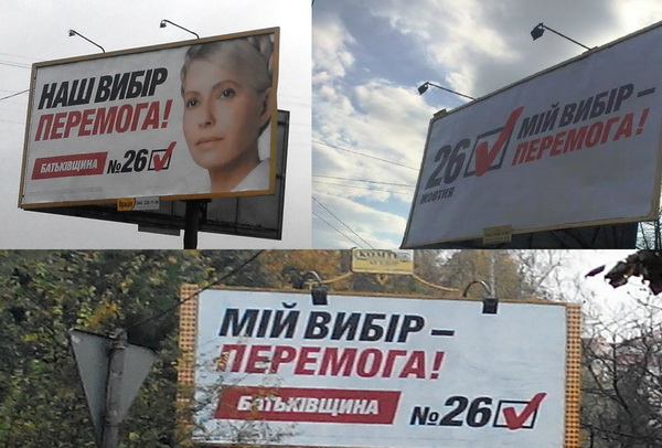 Зокрема, ВО Батьківщина на білбордах з вихідними даними закликає “Наш вибір перемога”, «Мій вибір – перемога. Батьківщина», а на знеоособлених без вихідних даних просто - “Мій вибір - перемога”. На обох білбордах міститься цифра 26 (номер в ВО Батьківщини у виборчому бюлетені) та квадратик з галочкою. http://i.imgur.com/A5B3znj.jpg