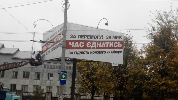 Блок Петра Порошенка на своїх білбордах з вихідними даними звертається до виборців “Голосу за перемогу! За мир! Час єднатись. Блок Петра Порошенка”. Тепер в таких же кольорах та стилістиці написано “За перемогу! За мир! Час єднатись. За гідність кожного українця!” ФОТО http://i.imgur.com/mFbxV6u.jpg