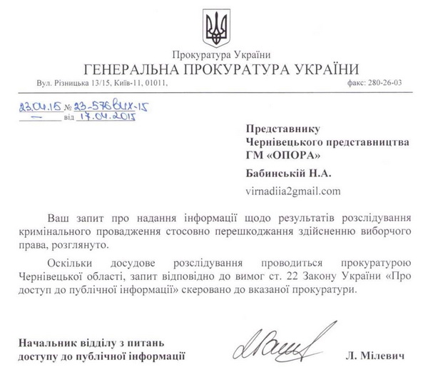 І от, у відповіді на запит від 23 квітня (звертаємо увагу на дату) ГПУ, яку ОПОРА Чернівці просила надати інформацію про стан розгляду справи щодо Папієва, каже, що "досудове розслідування ПРОВОДИТЬСЯ прокуратурою Чернівецької області" і запит скеровано їм.