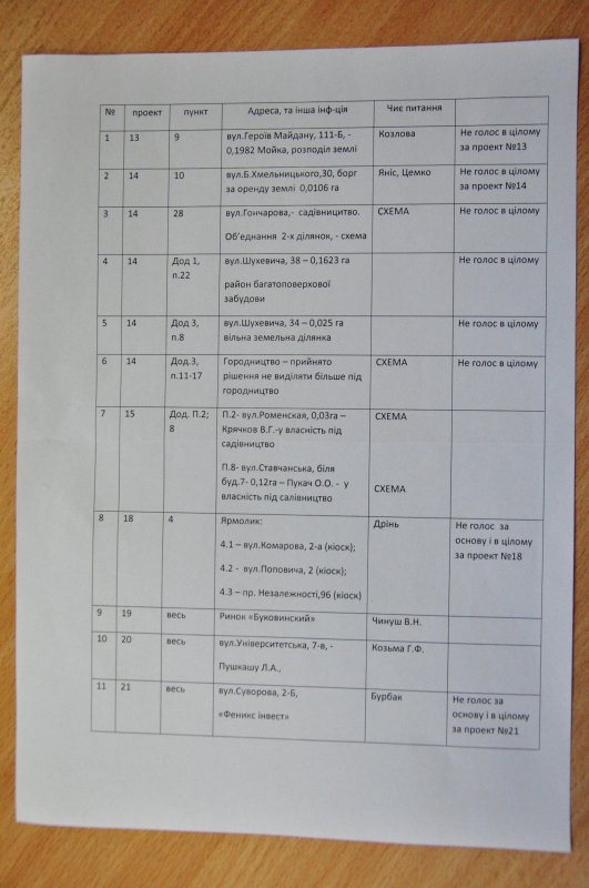 Натомість, навпроти пунктів питань, які нібито стосуються земельних ділянок депутата міськради Валерія Чинуша, а також депутата Чернівецької облради Георгія Козьми, жодних позначок немає.