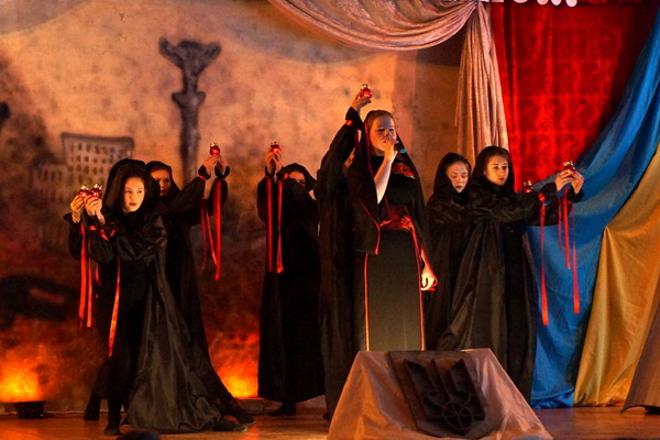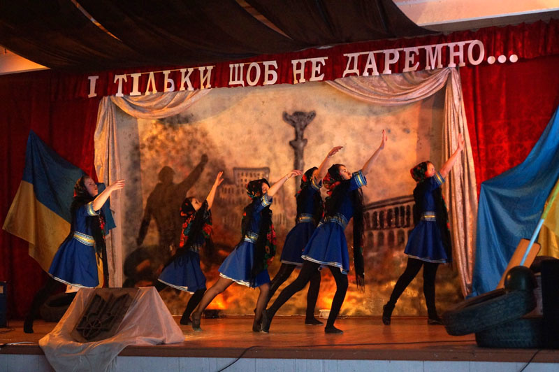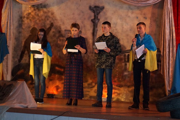 Ведуча цього реквієму Наталія Квятковська разом зі старшокласниками майстерно вплітала в канву заходу історичні акценти та героїчні події, повернувши врешті нас усіх до переломних подій листопада 2013 року, коли Гімн України набув нового звучання, а кольори національного прапора заяскарвіли новими відтінками у душах патріотів. Здавалося, що і ми, глядачі, на деякий час перенеслись на обпалений Майдан і, відчувши смертельний присмак того кривавого Водохреща, задихалися од палаючих шин… А все тому, що упродовж дійства перед нашими очима на увесь простір сцени стояла вражаюча реаліями картина Майдану, майстерно відтворена власноруч Юлією Борейко. Тож слово за словом, кадр за кадром душа здригалась од кожного факту, особливо, коли з екрану посміхались ті, хто поклав свої голови на новітній Голгофі України… Сюжет про юних ангелів Небесної Сотні так пронизував кожну струну, що мимоволі хотілось притиснути до грудей своїх дітей і по-материнськи всеперемагаюче захистити усіх нащадків роду українського!.. А між тим на сцені уже лилися нові сльози, щиро й акторськи довершено відтворені старшокласниками-учасниками заходу.