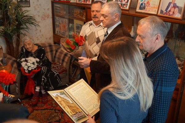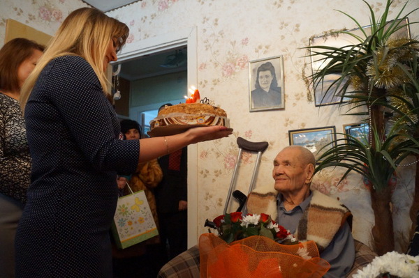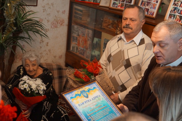 Погожий полудень зібрав чималу делегацію новодністровської громади, по-особливому осяйні погляди, квіти, дарунки свідчили про велику радість і гордість причетності до такої вагомої події, яка вперше в історії міста енергетиків вималювала таку неперевершену дату – 100 літ. Трепет, ніжність, захоплення, хвилювання, вдячність – усе це переповнювало серця кожного, хто завітав до оселі ювіляра. А щиру віншувальну церемонію розпочав Новодністровський міський голова Анатолій Болдашев, привітавши славного іменинника від імені усієї громади, низькоуклінно дякуючи за яскравий приклад мужності й любові до життя, вірності й відданості, і вручив ювіляру Пам’ятну адресу міської ради та сертифікат, який засвідчив отримання Федором Харлампійовичем 10 тисяч гривень. Під щирі оплески усіх гостей начальник відділу культури Альона Присакар подарувала від великої родини новодністровців іменинний торт, на якому сяяли вогні чарівної дати – 100. Мер міста Анатолій Болдашев передав також і офіційні поздоровлення від губернатора краю Олександра Фищука, голови Чернівецької облради Івана Мунтяна, депутата Верховної Ради України Максима Бурбака, обласної ветеранської організації. Міський голова вручив ювіляру ексклюзивний фотолітопис «Перших 100 років життя», створений за ідеєю директора Новодністровського міського історичного музею Галини Разгонюк та виготовлений на замовлення Новодністровської міської ради КП «ТРК „На своїй хвилі“» (верстка І. М. Лалак). Окрім життєпису та фото, які ілюструють сповнене бойової та трудової звитяги поважного ювіляра, видання також містить і поетичні присвяти Федору Харлампійовичу, написані новодністровськими поетесами Тамарою Морошан, Галиною Мельник та Інною Гончар, численні поздоровлення особливому імениннику.