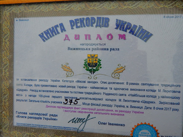 Під час колядування у Вижниці встановили черговий рекорд України, цього разу з наймасовішого та одночасного виконання Щедрика. Більше 300 учасників виконали знаний у всьому світі «Щедрик» Миколи Леонтовича. Нагадаємо, у листопаді 2016 року на відзначення 100-річчя першого виконання Щедрика стартував флешмоб «Щедрик 100 challenge».