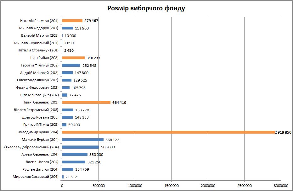 Серед тих 22 кандидатів, які подали остаточні фінансові звіти, Володимир Куліш, кандидат в народні депутати від Блоку Петра Порошенка в 204 виборчому окрузі, мав найбільший виборчий фонд - 2 919 850 грн. Найменша сума у виборчому фонді була у кандидатки в 201 виборчому окрузі від Української республіканської партії Наталії Стрельчук - 2 450 грн. Найбільші витрати в кандидатів в 204 виборчому окрузі - більше 3 мільйонів 720 тисяч гривень.