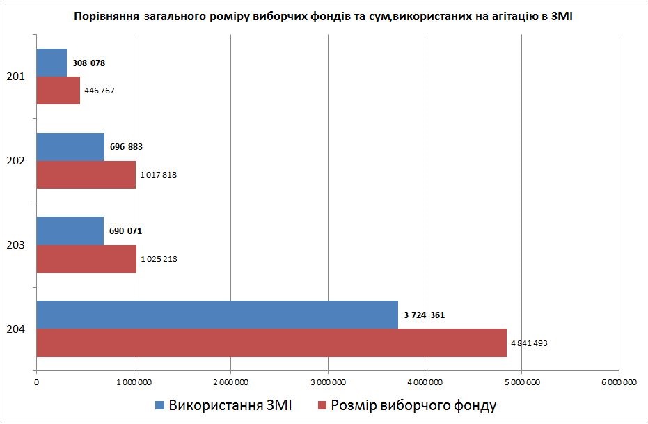 Отож, рекордна сума витрачнених коштів на агітацію зафіксована в 204 виборчому окрузі - майже 5 мільйонів гривень. Найменша сума витрачених коштів (майже 447 тисяч гривень), закономірно, зафіксовано в 201окрузі, де спостерігались найменша активність кандидатів та найменше агітації, . Практично однакова загальна сума виборчих фондів кандидатів в 202 та 203 округах (по трохи більше мільйона гривень).