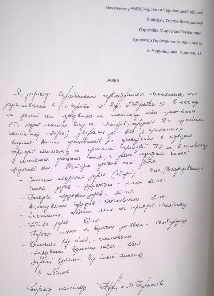 Так, в заяві йдеться про те, що в даному закладі працюють переважно жінки, і для виконання необхідних робіт потрібно прикласти чимало сил. Зокрема на прилеглій території будинку пристарілих потрібно вирубати близько 10 аварійних дерев, провести чистку фруктових дерев, посадити близько 30 саджанців фруктових дерев, пофарбувати лавиці, засипати щебенем ями та зробити безліч інших робіт для впорядкування території.