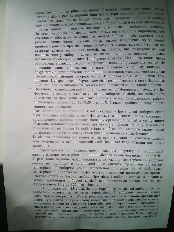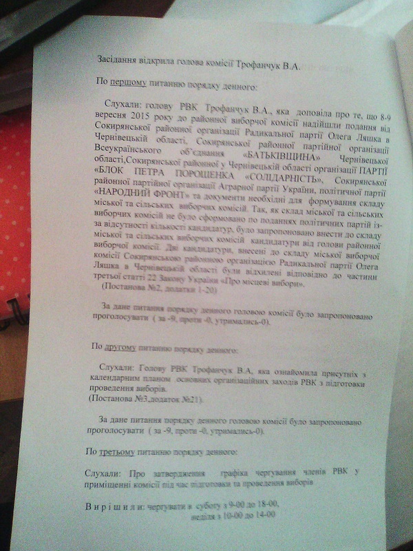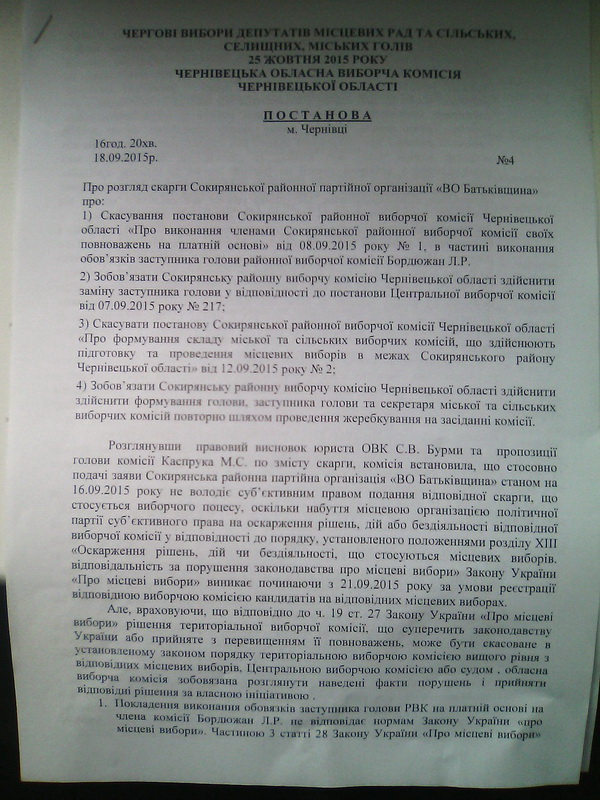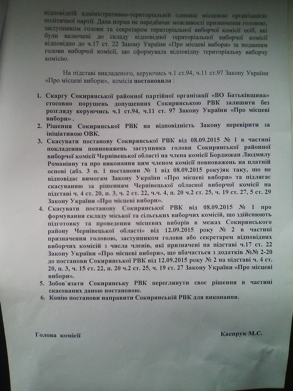 18 вересня Чернівецька обласна виборча комісія (ОВК) попри покладені на неї законом повноваження, постановила зобов’язати Сокирянську районну виборчу комісію здійснити заміну заступника голови районної ТВК відповідно до постанови ЦВК від 07.09.2015 р. № 217 та повторно, шляхом жеребкування, здійснити формування керівного складу сільських та міської виборчих комісій (фото 4-6).
