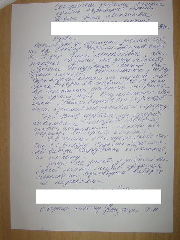 Тим часом голова Сокирянської РВК виявила порушення з боку Сокирянської районної організації ВО «Батьківщина», що стосувалися поданих нею заяв про згоду осіб на участь у роботі сільських виборчих комісій. За словами керівника комісії, заяви були написані двома почерками, а не власноручно особами, запропонованими до складу територіальних виборчих комісій, що суперечить ч. 10 ст. 22 Закону України «Про місцеві вибори» (фото 7-8).