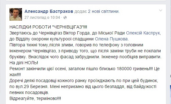 Водночас, як повідомив мешканець будинку Олександр Бастраков, фасад цього об'єкту цінної забудови вже сплюндровано.