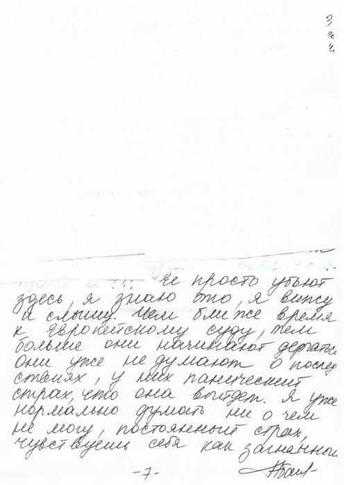 Эти люди не останавливаются ни перед чем. Я боюсь за себя, но еще больше я боюсь за нее, потому что вижу и слышу, что здесь творится. Они не дают ей встречаться с журналистами, не пускают к ней ее защитников, не пускают ее дочь, специально для того, чтобы заставить ее сломаться.