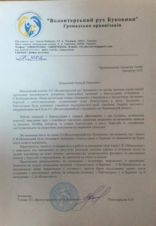 Громадська організація "Волонтерський рух Буковини" теж стала на захист начальника інспекції з питань благоустрю Чернівців Сергія Обшанського, якого переслідують депутати Чернівецької міської ради.