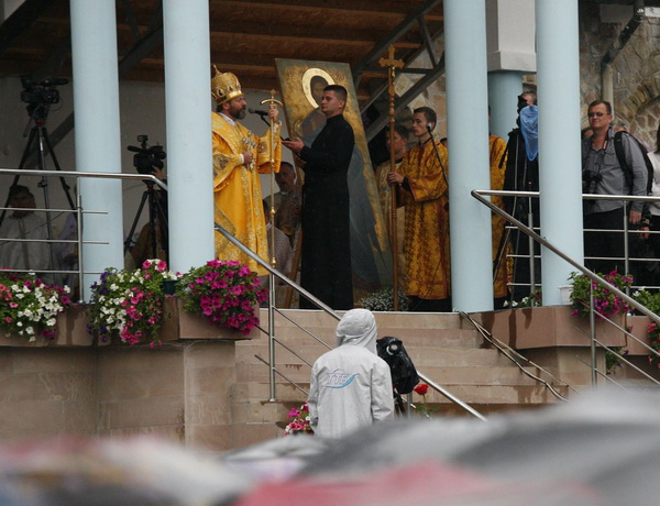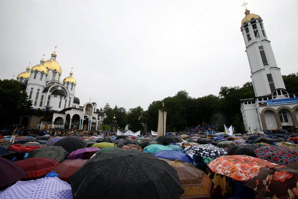 Разом із десятками тисяч вірян під зливою він взяв участь у Святій Літургії в Марійському духовному центрі Зарваниці.