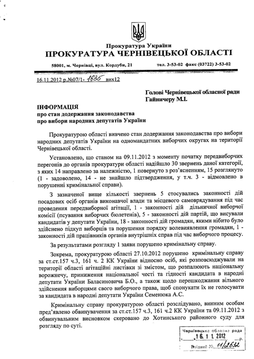 На ім’я голови Чернівецької обласної ради Михайла Гайничеру надійшла інформація прокурора Чернівецької області Петра Коваля про стан додержання законодавства про вибори народних депутатів України на одномандатних виборчих округах на території Чернівецької області.
