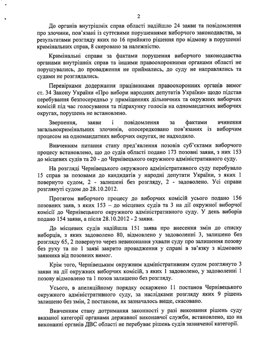 - Таким чином, порушення виборчого законодавства, які вплинули на волевиявлення громадян на одномандатних виборчих округах №201-204 під час виборчого процесу на території Чернівецької області, відсутні, - йдеться у документі.