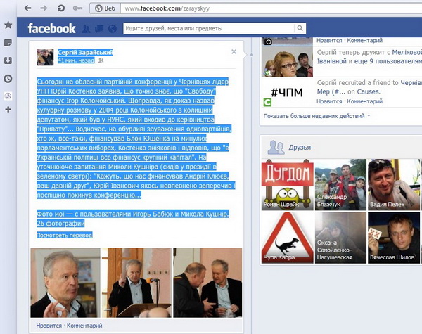 "Сьогодні на обласній партійній конференції у Чернівцях лідер УНП Юрій Костенко заявив, що точно знає, що "Свободу" фінансує Ігор Коломойський, - написав на своїй сторінці у ФБ журналіст Сергій Зарайський. - Щоправда, як доказ назвав кулуарну розмову у 2004 році Коломойського з колишнім депутатом, який був у НУНС, який входив до керівництва "Привату"... Водночас, на обурливі зауваження однопартійців, хто ж, все-таки, фінансував Блок Ющенка на минулих парламентських виборах, Костенко зніяковів і відповів, що "в Українській політиці все фінансує крупний капітал". На уточнююче запитання Миколи Кушніра (сидів у президії в зеленому светрі): "Кажуть, що нас фінансував Андрій Клюєв, ваш давній друг", Юрій Іванович якось невпевнено заперечив і поспішно покинув конференцію..."